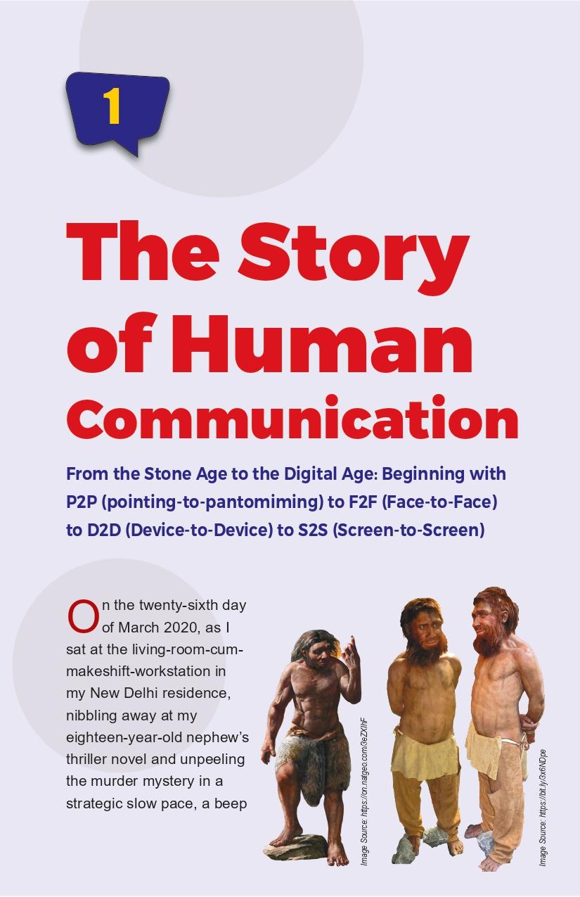 - The Story of Human Communication from Stone Age to Digital Age: this opening chapter discusses the evolution of human communication from P2P (pointing-to-pantomiming) to F2F (Face-to-Face) to D2D (Device-to-Device) to S2S (Screen-to-Screen). The chapter also explores the historical context and development of communication methods, including gestures, vocalisations, and written forms.