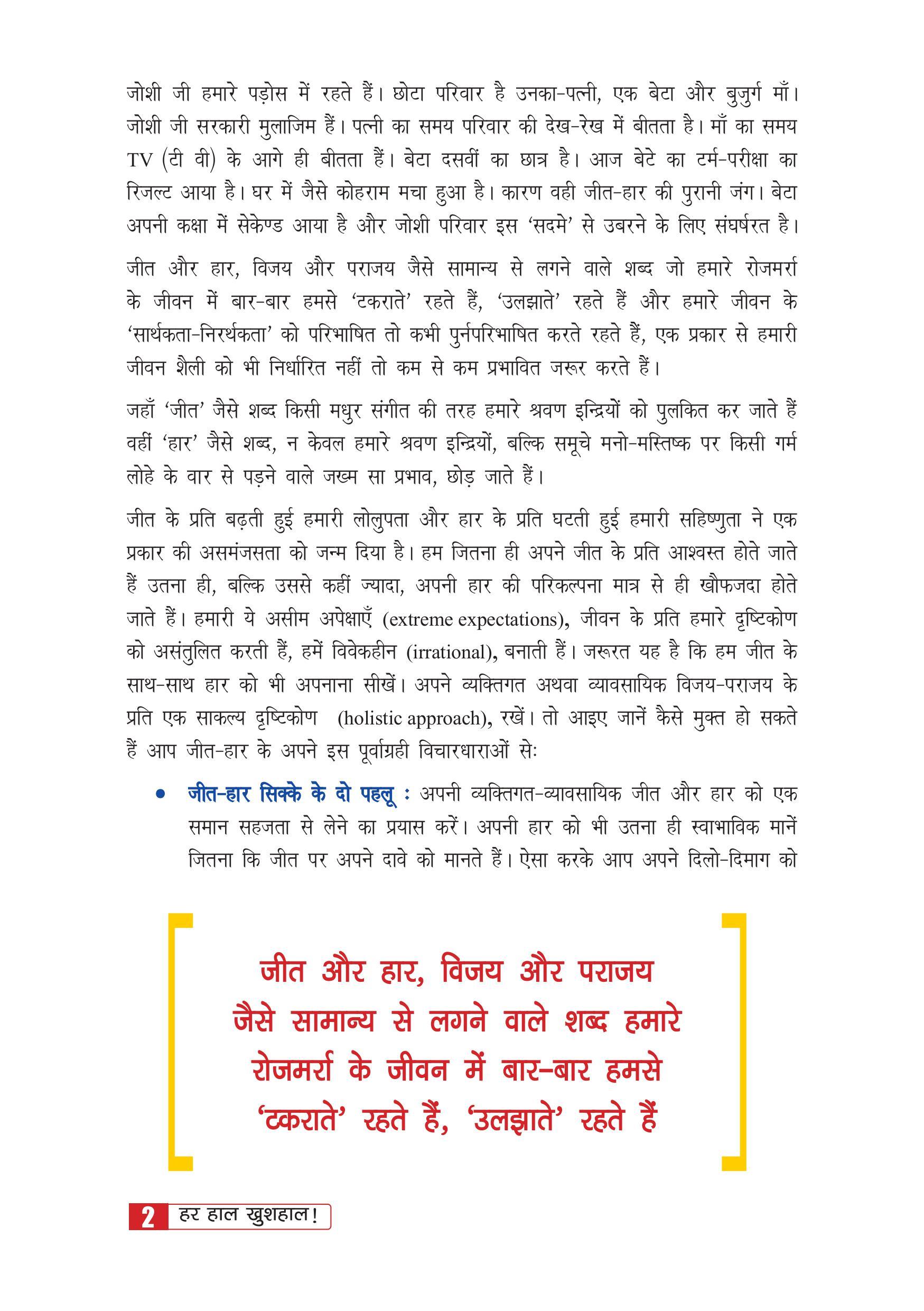 ‘हर हाल खुशहाल’ (भाग 1)पाठकों को अपने जीवन के प्रत्येक पहलू को पूरी तरह से जीने के लिए प्रेरित करती है, चाहे वे सुखद हों या कठिनाईपूर्ण। पुस्तक में 30 अध्याय हैं, जो व्यक्तिगत विकास, करियर निर्माण, आत्म-प्रेरणा, और सामूहिक सफलता के विभिन्न पहलुओं पर विस्तार से चर्चा करते हैं। यह पुस्तक आपको सिखाएगी कि कैसे सफलता और असफलता दोनों को समान रूप से स्वीकार करें और अपने जीवन के लक्ष्यों को प्राप्त करने के लिए एक मजबूत मानसिकता विकसित करें।
